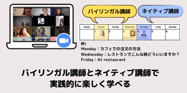 週ごとに同じテーマ、バイリンガル講師とネイティブ講師から学べるので、わからないまま過ぎ去るレッスンではなく学んだ英語をすぐに試せる実践的なグループレッスン