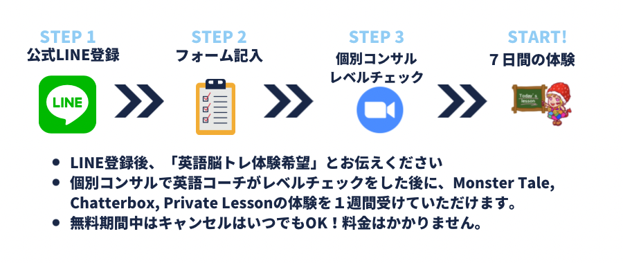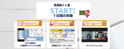 英語脳トレ塾体験のスタートです。あなたの学習スタイルに合わせて調整ができますので、効果的に学べる方法で英語脳トレを体験していただけます。