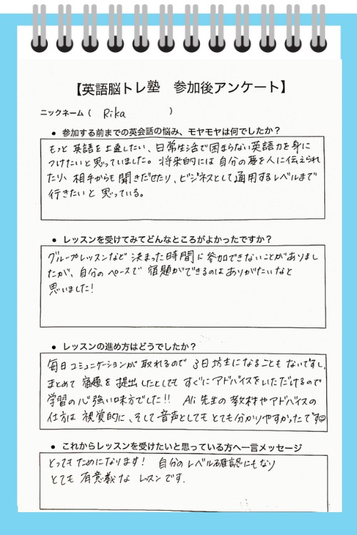 グループレッスンなど決まった時間に参加できないことがありましたが、自分のペースで宿題ができるのはありがたいと思いました。 毎日コミュニケーションが取れるので、3日坊主になることもないですし、まとめて宿題を提出してもアドバイスをいただけるので、学習の強い見方でした! Ali先生の教材やアドバイスの仕方は、視覚的に、そして音声としてもとてもわかりやすかったです。とてもためになります!自分のレベル確認にもなりとても有意義です! |