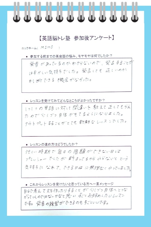 発音があってるのかわからないので、発言するのが恥ずかしい気持ちでした。 正しいのか確認する機会もありませんでした。 一つ一つの単語を教えてもらい、アウトプットするのが新鮮なレッスンでした。 忙しい時間で毎日の宿題がでいない日はプレッシャーだったが、貯まっているからやらなきゃという気持ちになれて、できる日には無理なくできました。 自分で考えて文を作ったりすることが少しずつ自信へと繋がっていくのではないかと思いすごくお勧めしたいレッスンです。