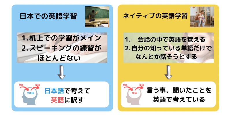 学習をする方が悪いと言っているわけでもありませんし、教える側の能力が低いとも言うつもりはありません。 ただ私は英語ができるようになる為にはネイティブが英語を話すように、聞くことや話すことを英語を考えられるようになる正しいメソッドでやる必要があるというのをお伝えしたいのです。 難しい単語を知っていなくても、自分の知っている単語だけで、思いを伝え、英会話をすることは可能です。 結局、机上の学習方法では、【知識】は身についても、思ったことをすぐに話せる【会話力】は身につけられないのです。