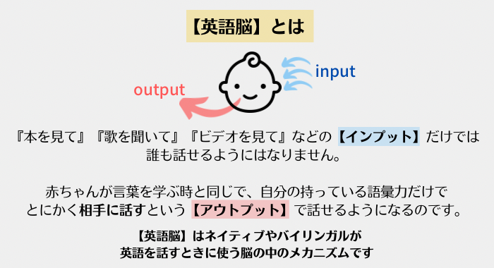 言う事や聞いたことを英語で考えて話す=ネイティブやバイリンガルが使う英語脳の取得が絶対に必要です。つまり英語脳を使うトレーニングが不可欠なのです。