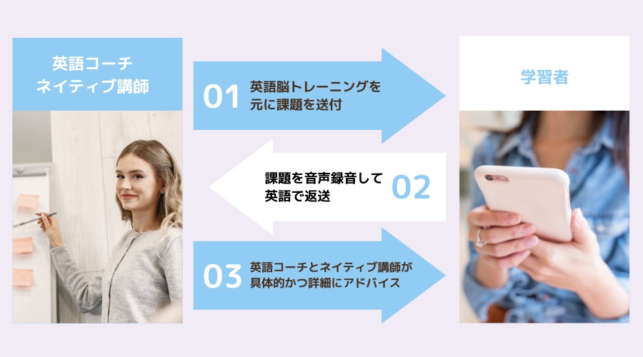 毎日、スキマ時間で課題にそって音声を提出。期限なく講師と音声でやりとりをし、英語脳トレを鍛えます。